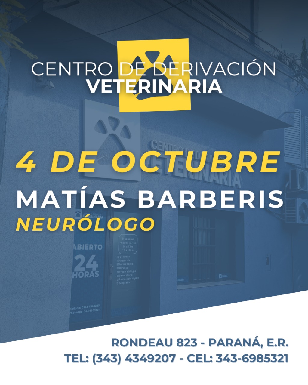 novedades 21 septiembre, 2025 novedades 👨🔬 El Dr. Matías Barberis estará atendiendo el 4 de Octubre en nuestro Centro Veterinario. 📲 Turnos con anticipación al: 3436985321 📍 También podés encontrarnos en Rondeau 823 (a metros de Churruarín)