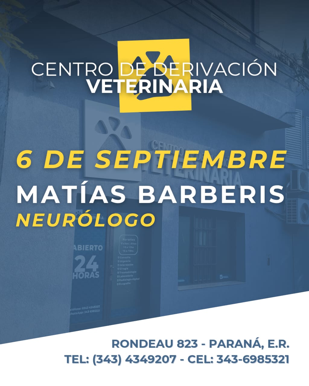 novedades 28 agosto, 2025 novedades 👨🔬 El Dr. Matías Barberis estará atendiendo el 6 de Septiembre en nuestro Centro Veterinario. 📲 Turnos con anticipación al: 3436985321 📍 También podés encontrarnos en Rondeau 823 (a metros de Churruarín)
